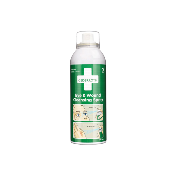 Cederroth eye & wound cleansing spray. Geschikt voor het reinigen en wegspoelen van stof en vuil uit ogen en wonden. Fles kan geplaatst worden in het Cederroth EHBO paneel.