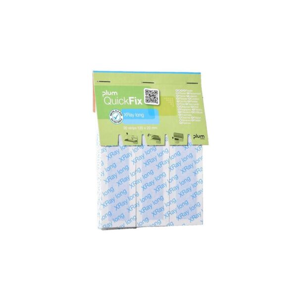 De Plum QuickFix XRay Long navulling bevat 30 extra lange, blauwe pleisters die zowel röntgen- als metaaldetecteerbaar zijn. Ideaal voor het snel en hygiënisch afdekken van vingerwonden in de voedingsindustrie en andere omgevingen waar detectie van vreemde voorwerpen essentieel is.